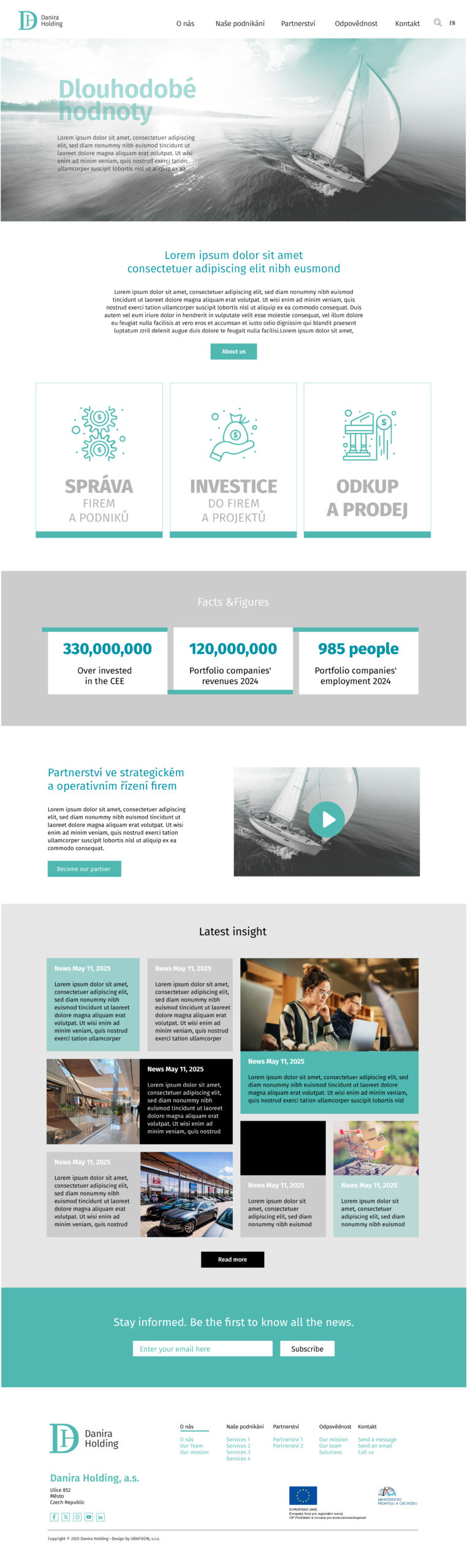 Barevnost kombinuje sofistikovanou černou s odstíny tyrkysové, které působí svěže, sebevědomě a moderně. Výsledkem je identita, která se pohybuje na pomezí tradice a inovace – reprezentativní pro holdingovou společnost s vizí a pevným základem.